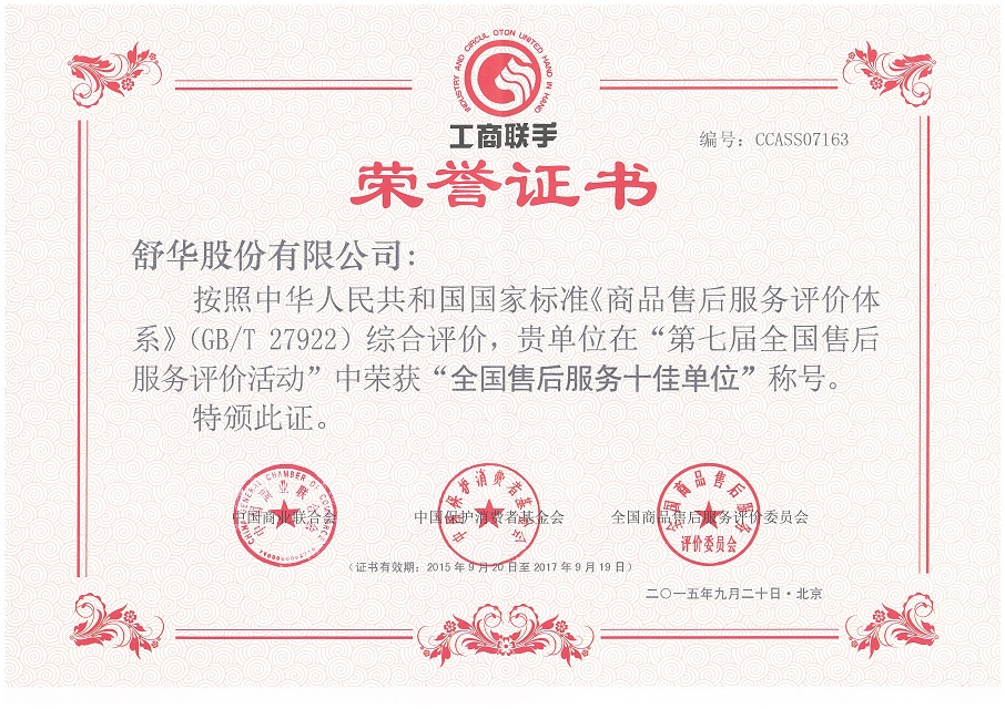 2015 全国售后服务十佳单位 全国商品售后服务评价委员会 荣誉证书 查看