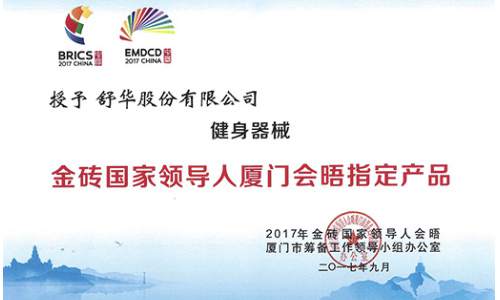 2017年,中欧体育健身器材入驻厦门金砖国家领导人会晤,并成为厦门金砖会晤指定健身器械。X6豪华智能家用跑步机荣获中国好设计金奖。 2017, Shuhua fitenss equipment presented itself in Xiamen as the designated fitness equipmentof Xiamen BRICS summit. X6 luxurious home use treadmill won gold award of China Good Design.